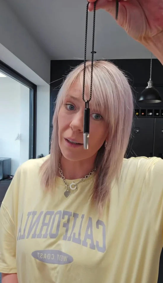 Направи бавно вдишване с колието, когато усетиш желание — помага ти да останеш съсредоточен, да държиш ръцете си заети и да имаш повече контрол през деня.