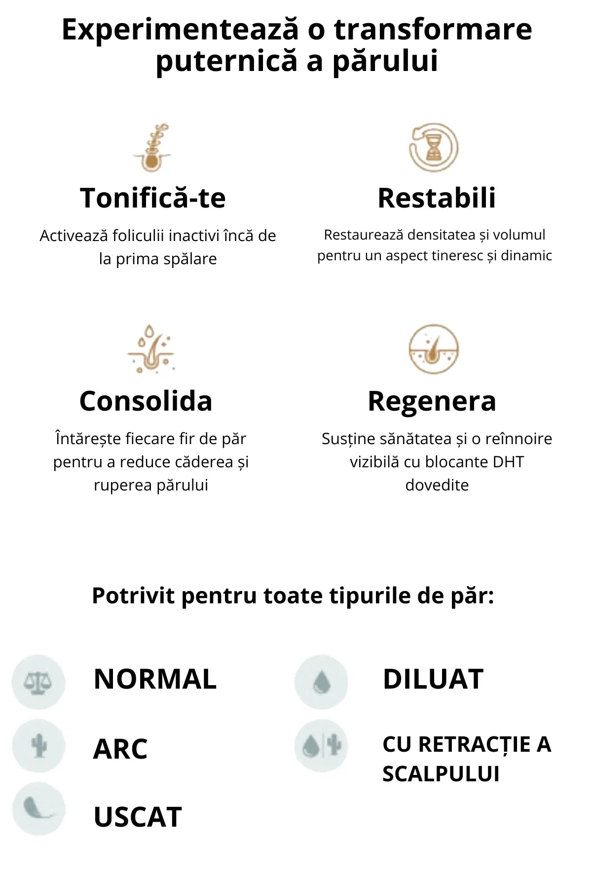 • Rutina compatibilă: funcționează cu minoxidil, vopsea de păr și după transplant (după recuperare).