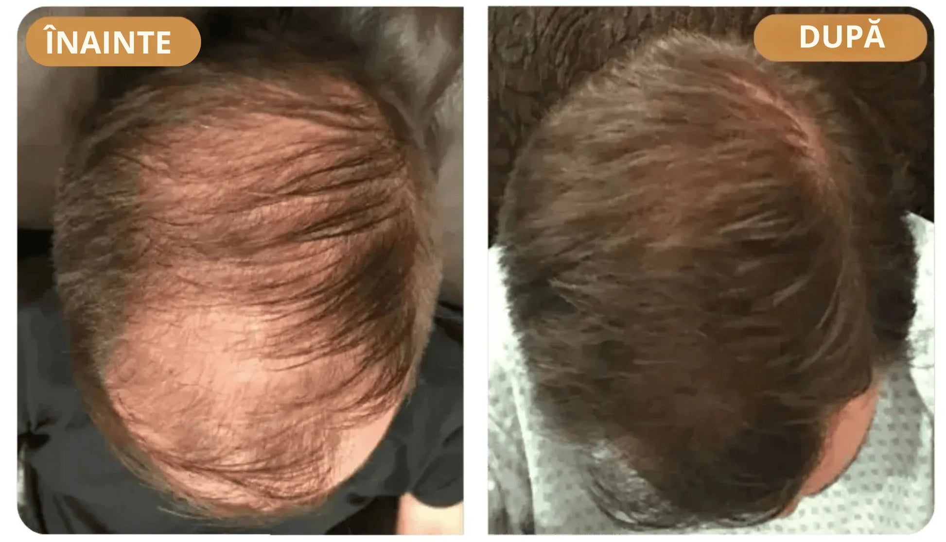 Înainte → După (12 săptămâni): Mai puțină cădere a părului în timpul dușului, aspect mai plin în partea superioară. Rezultatele pot varia.
