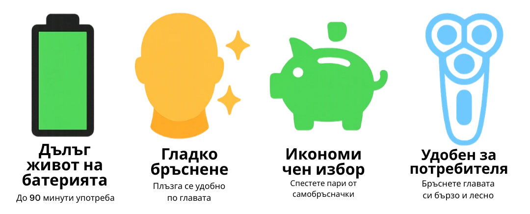 Нашата самобръсначка е проектирана за бързо и ефикасно бръснене. Множеството въртящи се ножчета работят заедно, за да отрежат космите бързо и равномерно — така че можете да обръснете главата си само за 90 секунди. Мощният мотор осигурява стабилно бръснене, като допълнително намалява необходимото време.